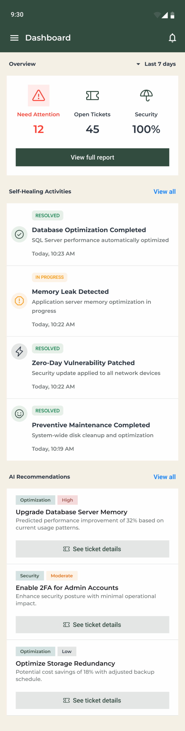 Autonomous Resolution is driven by intelligence, not static scripts. We achieve true autonomous issue resolution utilizing dynamic LLM-powered remediation. This results in AI-driven self-healing actions that are tailored, comprehensive, and eliminate manual intervention for complex problems.